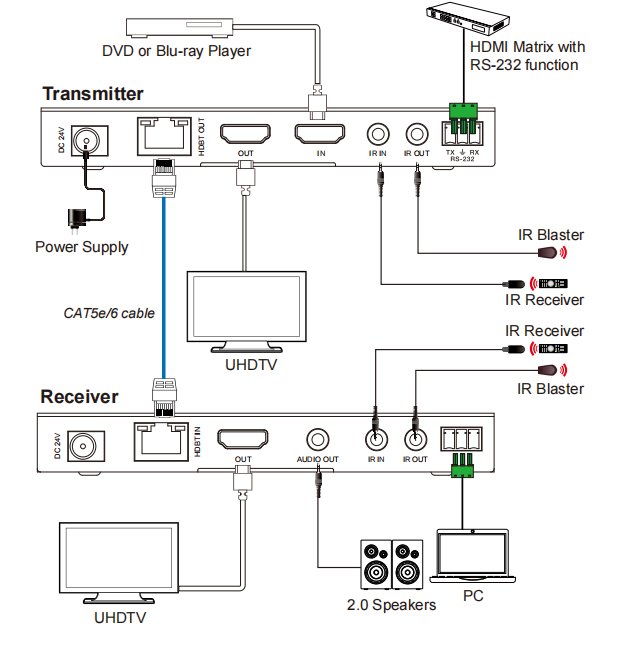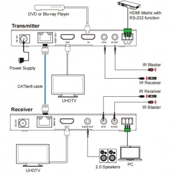 Комплект передатчик-усилитель и приемник сигнала HDMI по витой паре, 4K 60Гц 4:4:4, HDMI 2.0 (18Гб/с), HDBT, 1080p до 150м (4K до 120м), HDMI loop, Деэмбеддер, HDCP 2.2, RS232, IR, PoC двусторонний