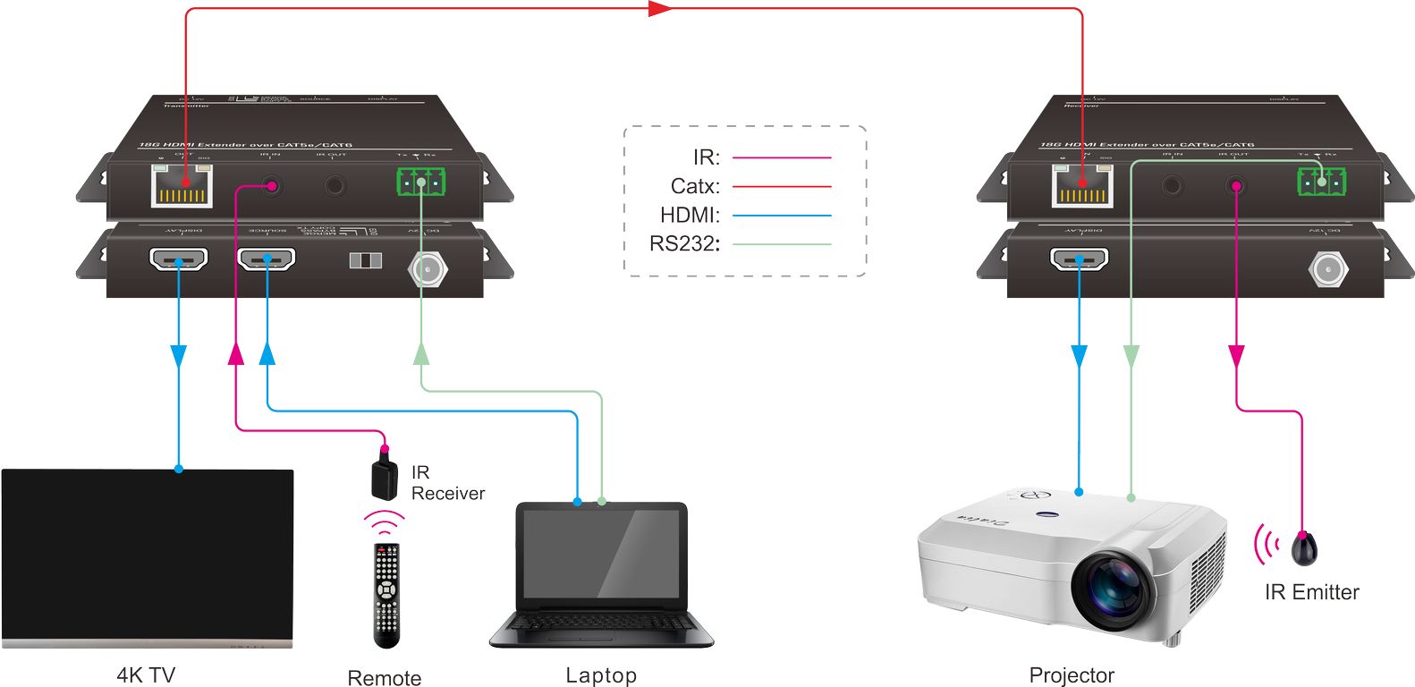 Комплект передатчик-усилитель и приемник сигнала HDMI по витой паре. 4K 60Гц 4:4:4, 4K до 1080p масштабирование, HDMI 2.0 (18Гб/с), 1080p до 80м (4K до 70м), RS232, IR, HDMI loop, HDCP 2.2, EDID, PoC