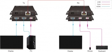 Комплект передатчик-усилитель и приемник сигнала HDMI по витой паре. 4K 30Гц 4:4:4, 4K до 1080p масштабирование, HDMI 1.4 (10,2 Гб/с), 4K и 1080p до 120 м, USB 1.1, HDMI loop, HDCP 1.4, EDID, двусторонний PoC