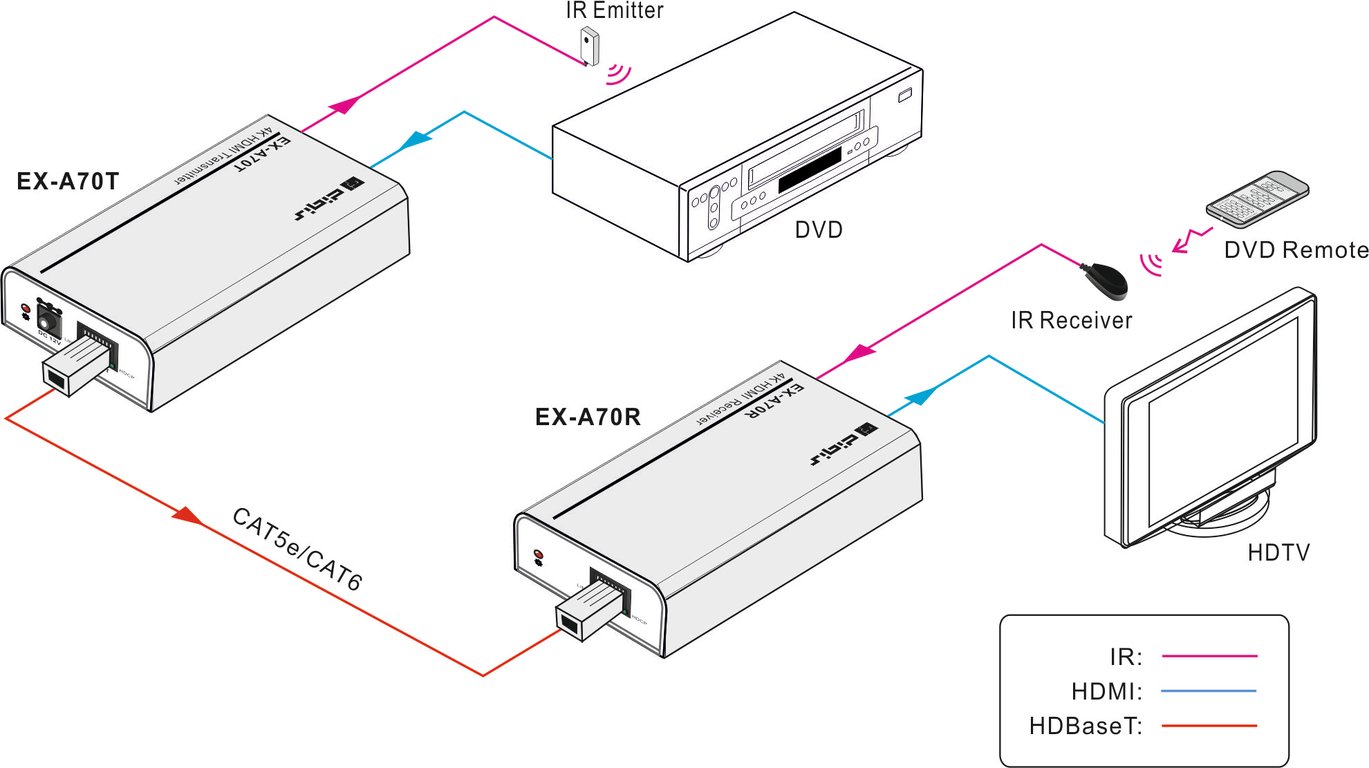 Комплект передатчик-усилитель и приемник сигнала HDBT - HDMI, 4K, 70m Комплект EX-A70 преобразует HDMI сигнал по стандарту HDBT и может передавать его по кабелю на витой паре на расстояние до 70 метров.
